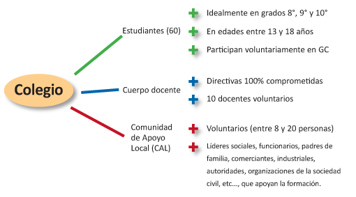 La Constitución Política de 1991 señala que el Estado, la sociedad y la familia son responsables de la educación. Por eso, aunque La Ley General de Educación concibe como actores de la "comunidad educativa" a los estudiantes, los docentes, las directivas docentes y los padres de familia, Gestión Ciudadana plantea la participación en el programa de una comunidad educativa ampliada a la que llamamos Comunidad de Apoyo Local —CAL—. En la CAL de una IE puede haber funcionarios públicos, gestores sociales, jueces de paz, otros líderes, consejeros de juventud, concejales o ediles, industriales, comerciantes, etc..., que voluntariamente aportan al proceso su tiempo, conocimientos, gestión de recursos educativos y apoyo logístico, entre otros.